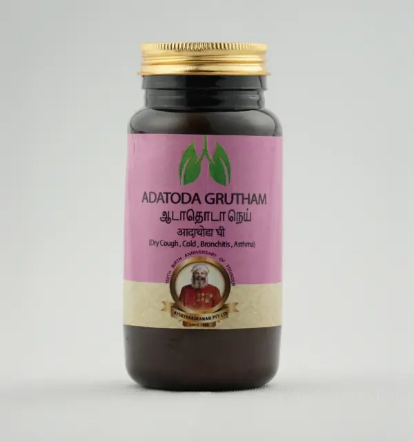 Adhatoda Ghritam is a nourishing herbal ghee-based preparation infused with the potent herb Adhatoda vasica (Vasaka), traditionally used to soothe respiratory distress and bolster the lungs. The ghee base enhances absorption and delivers deep cooling and restorative benefits.