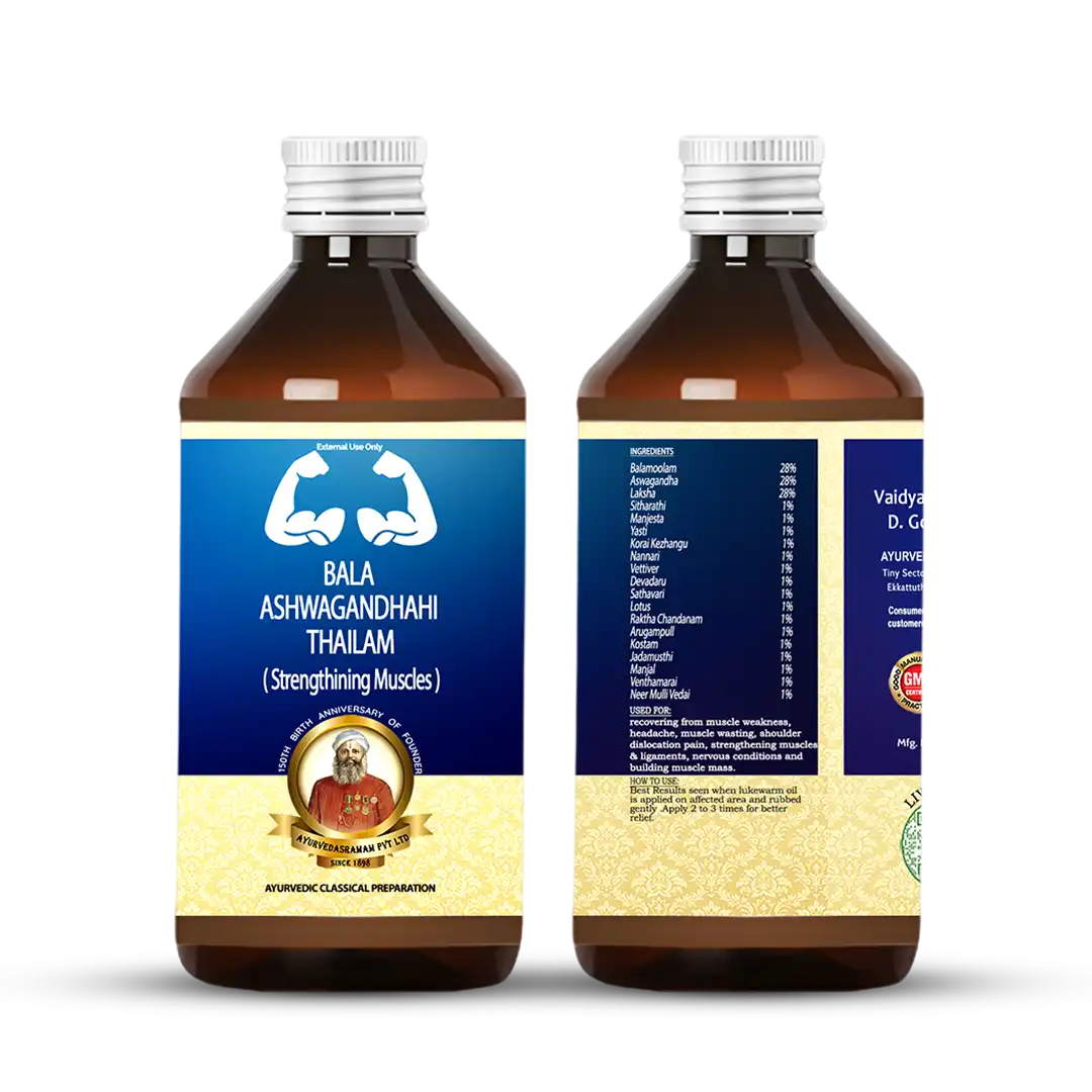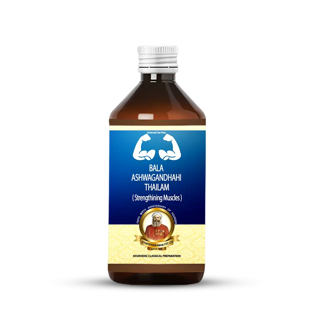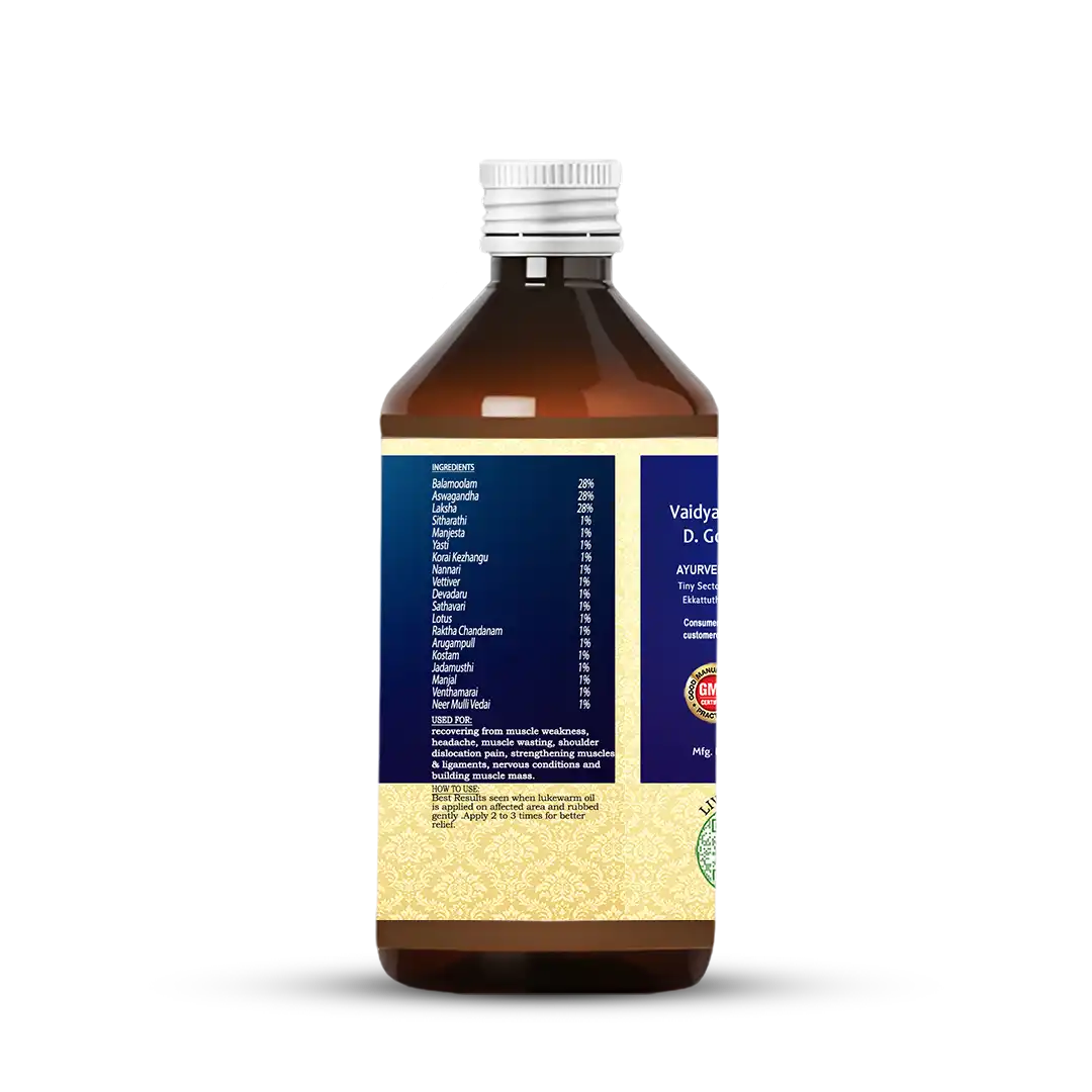 A deeply nourishing Ayurvedic massage oil crafted with Bala (Sida cordifolia), Ashwagandha, Laksha, and other herbs in a sesame oil base. It’s traditionally revered for strengthening muscles, soothing nerves, and revitalizing the body—especially after illness or in cases of weakness.