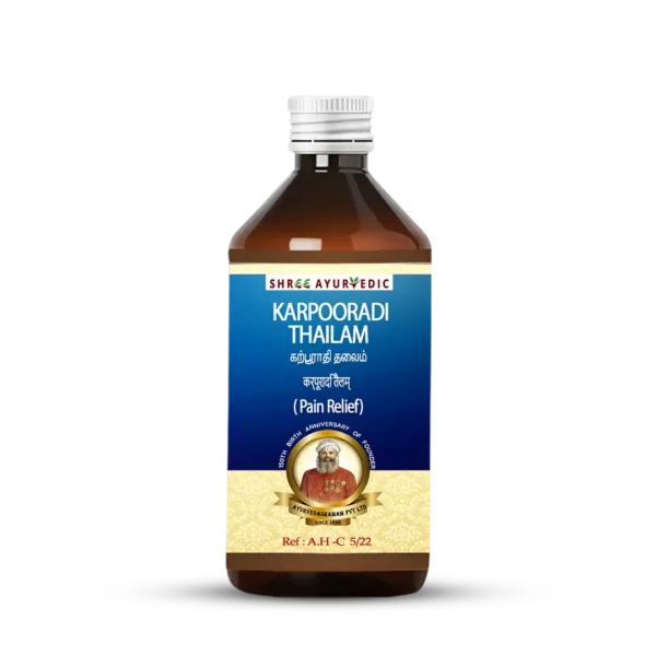 Karpooradi Tailam is a traditional Ayurvedic medicated oil enriched with camphor (Karpoora) and other warming herbs, formulated using Kerala Ayurveda principles. It is highly valued for its swift relief from muscular and rheumatic pain, stiffness, and even nasal congestion when applied topically.