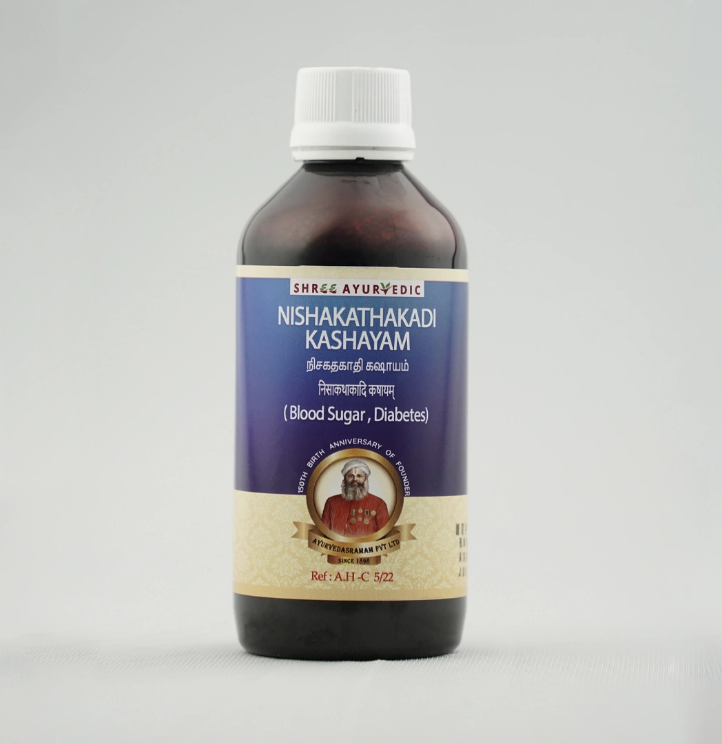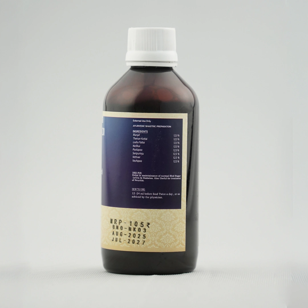 Nisha Katakadi Kashayam is a classic Ayurvedic decoction featuring herbs like Turmeric, Lodhra, Amalaki, and Vetiver. It’s recognized for its antidiabetic, hepatoprotective, and strengthening actions—beneficial for urinary, metabolic, and skin health.
