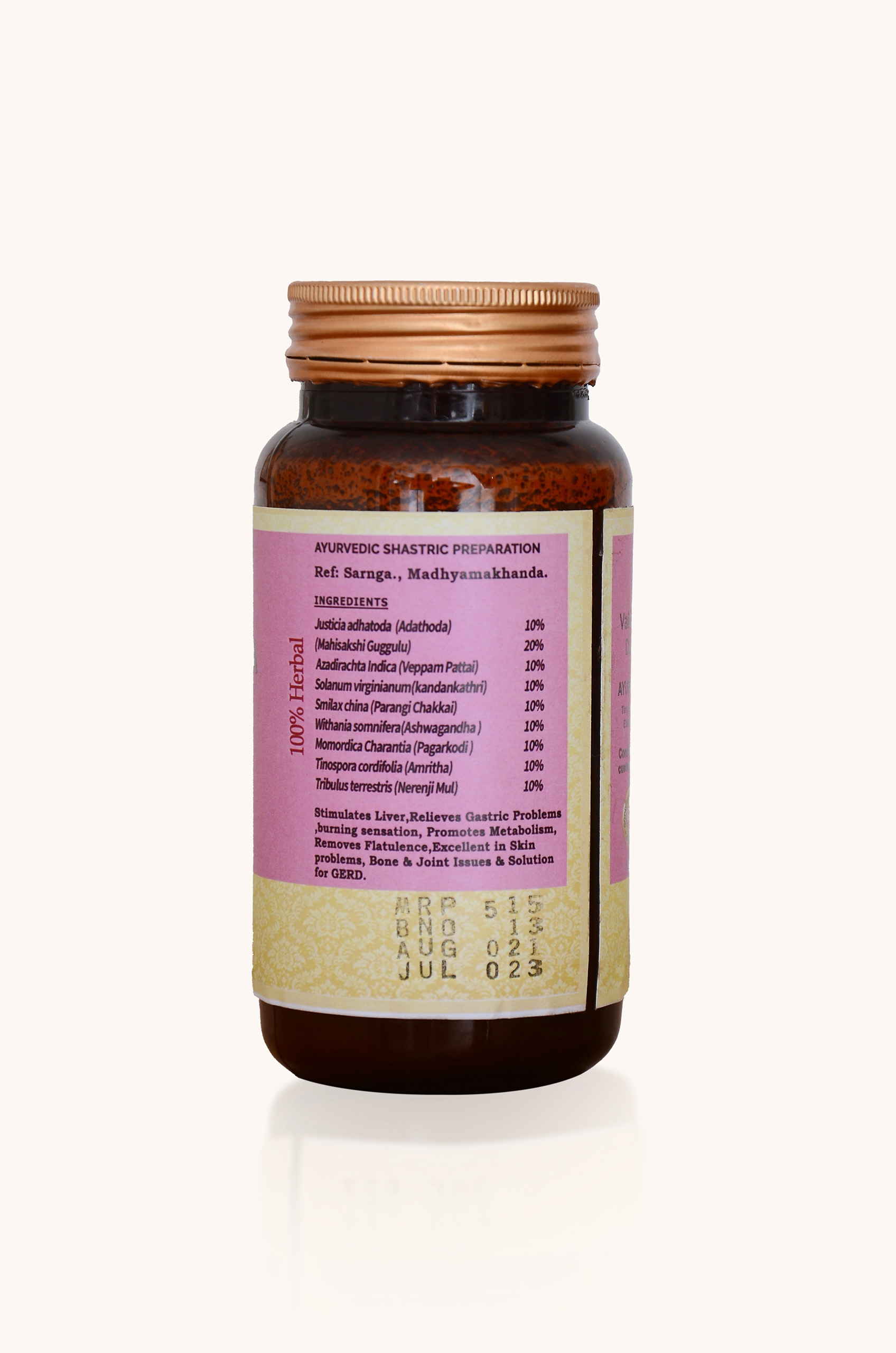 A powerful Ayurvedic healing blend of bitter herbs, ghee, and guggulu designed for systemic detoxification, rejuvenation, and deep nourishment on multiple levels.