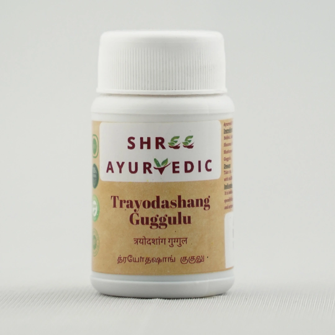 Trayodasanga Guggulu is a traditional polyherbal formulation enriched with Guggulu resin and a synergistic blend of thirteen potent herbs. Revered in classical Ayurveda, it targets Vata imbalances to soothe joint, muscle, and neural discomfort, while fortifying bones, ligaments, and nerves.